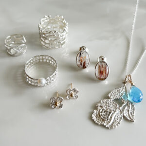 アンティークレースを型取り鋳造したジュエリー 繊細な模様はアート作品のような美しさを持ち、身につけることで特別な気分にさせてくれます。また、天然石を使用したピアスやネックレス、チャームもご用意しております。