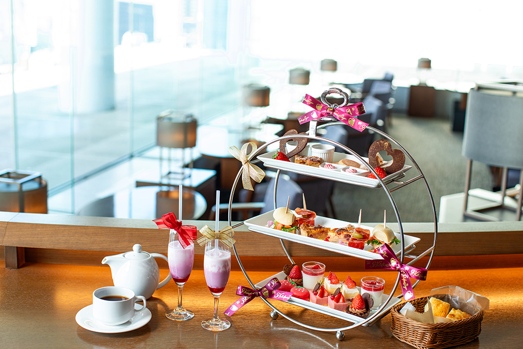 苺づくしのスイーツをリボンをあしらった愛らしいハイティースタンドでお届けする、バレンタイン限定アフタヌーンティー。