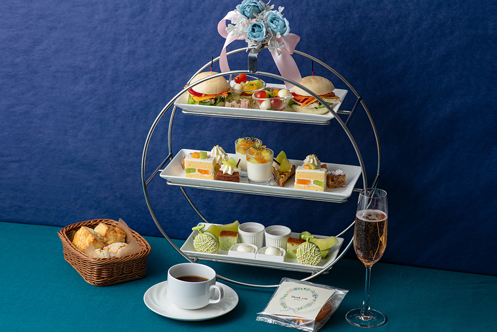フラワーリボンのスタンドが華やかなハイティースタンドでお届けするのは、メロンを主役にしたアフタヌーンティー。
